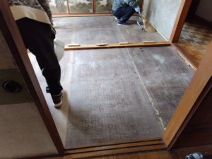 畳を撤去して、新しく下地を補強して、断熱材と合板、フローリングへと入ります。