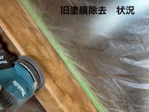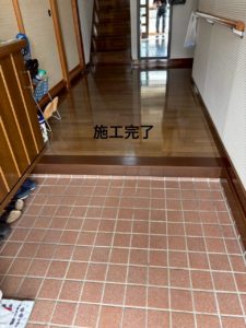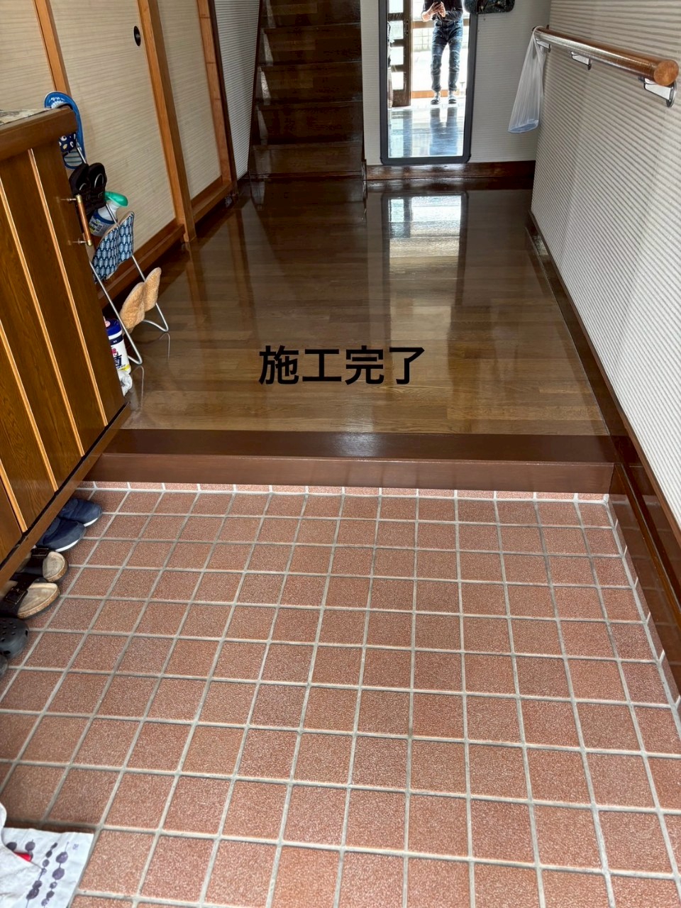 玄関の上がり框を丁寧に再塗装してます