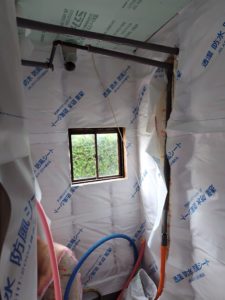 既存ユニットバスの解体が終了して、壁下地の補強と断熱充填工事が完了して