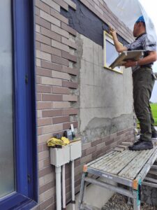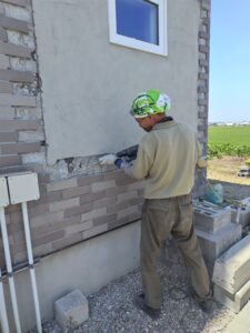 2025-07-15 きっちりタイル工事 浴室改修に伴い外窓交換の為のタイル修繕工事中です 既存タイル目地に合わせて慎重に一部タイルを撤去してます 下地を十分割れさせて、目地墨を確認して、接着剤を塗り、タイルを貼って行きます。