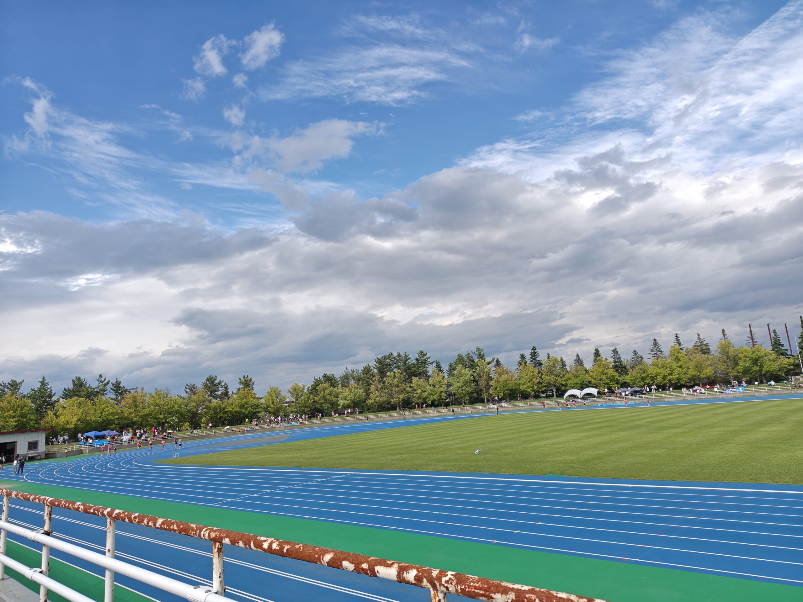 孫と一緒に息子の応援に運動公園競技場に来てます!