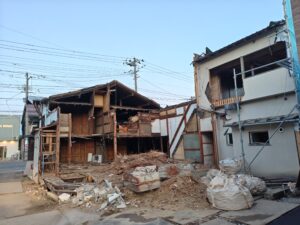 2025-10-04 慎重に解体工事 代々受け継がれてきた店舗兼住宅ですが、新しい住宅が完成していよいよお役御免となり、解体工事が始まりました。 隣地と全面道路に仮設足場を設置して、安全第一で作業中です。