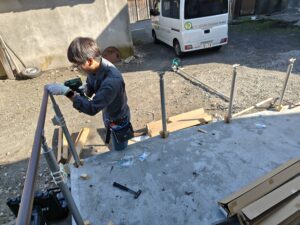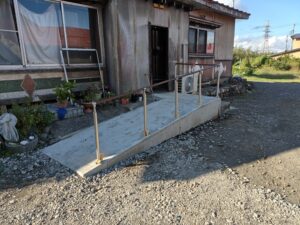 前回玄関からのスロープ工事を行い手すりを施工中です。