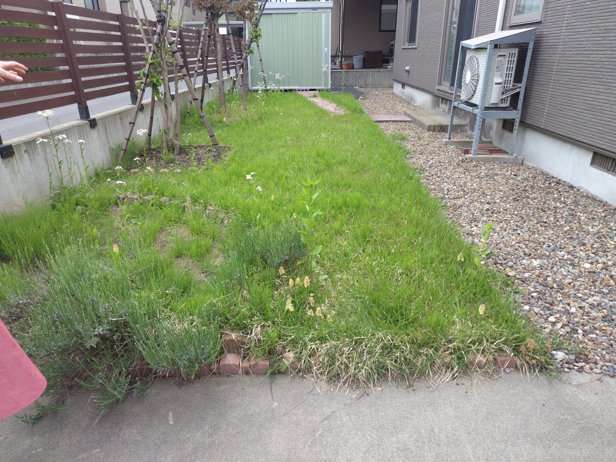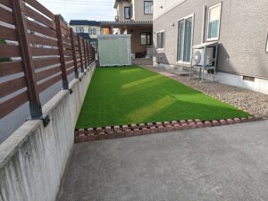 2025-10-27 素敵にガーデニング あまり手入れがいらない、見栄えのいいガーデニングお願いします! なんてことでしょ! 全面に防草シートAを敷き詰めて、超人工芝Sを継ぎ目を気を付けて敷き並べ縁は少しアクセントを取り入れました。