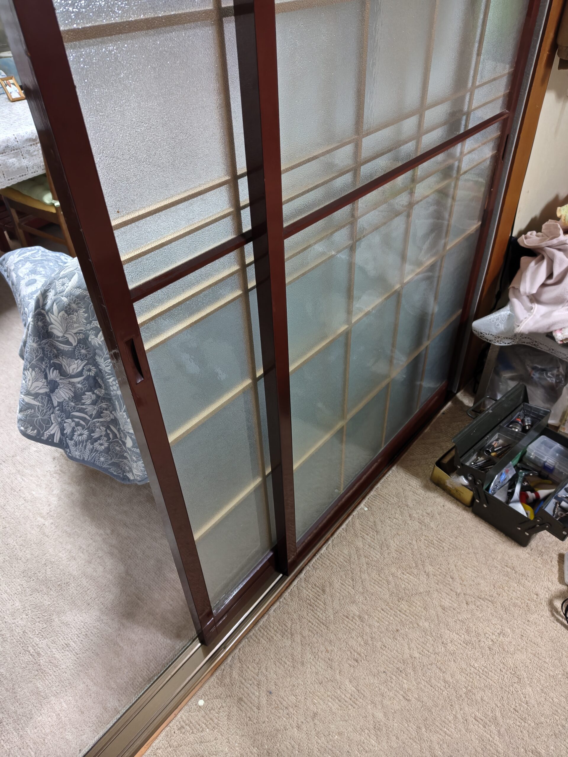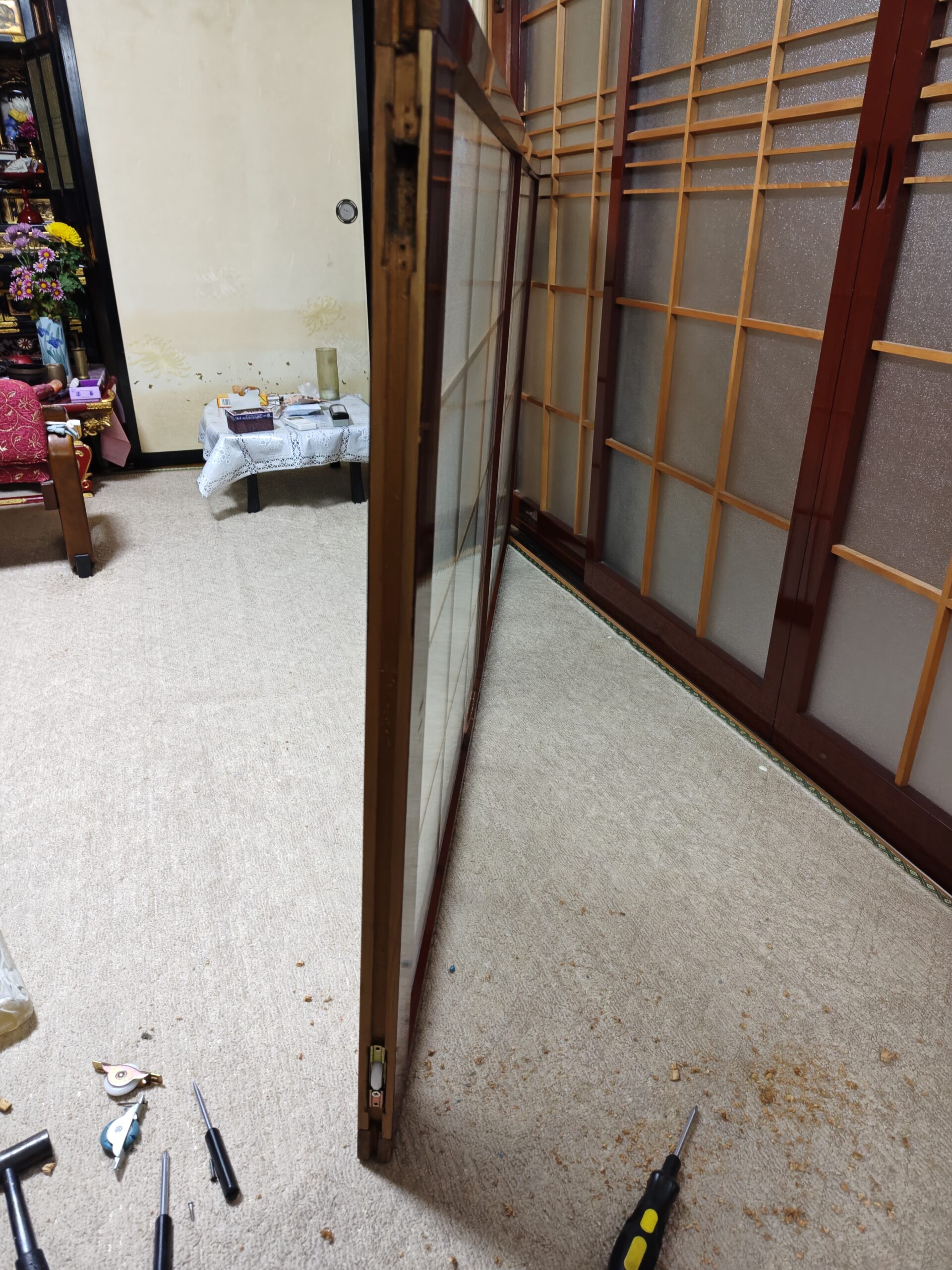 ボコボコの戸車を取外し、新しい戸車へ交換してます。