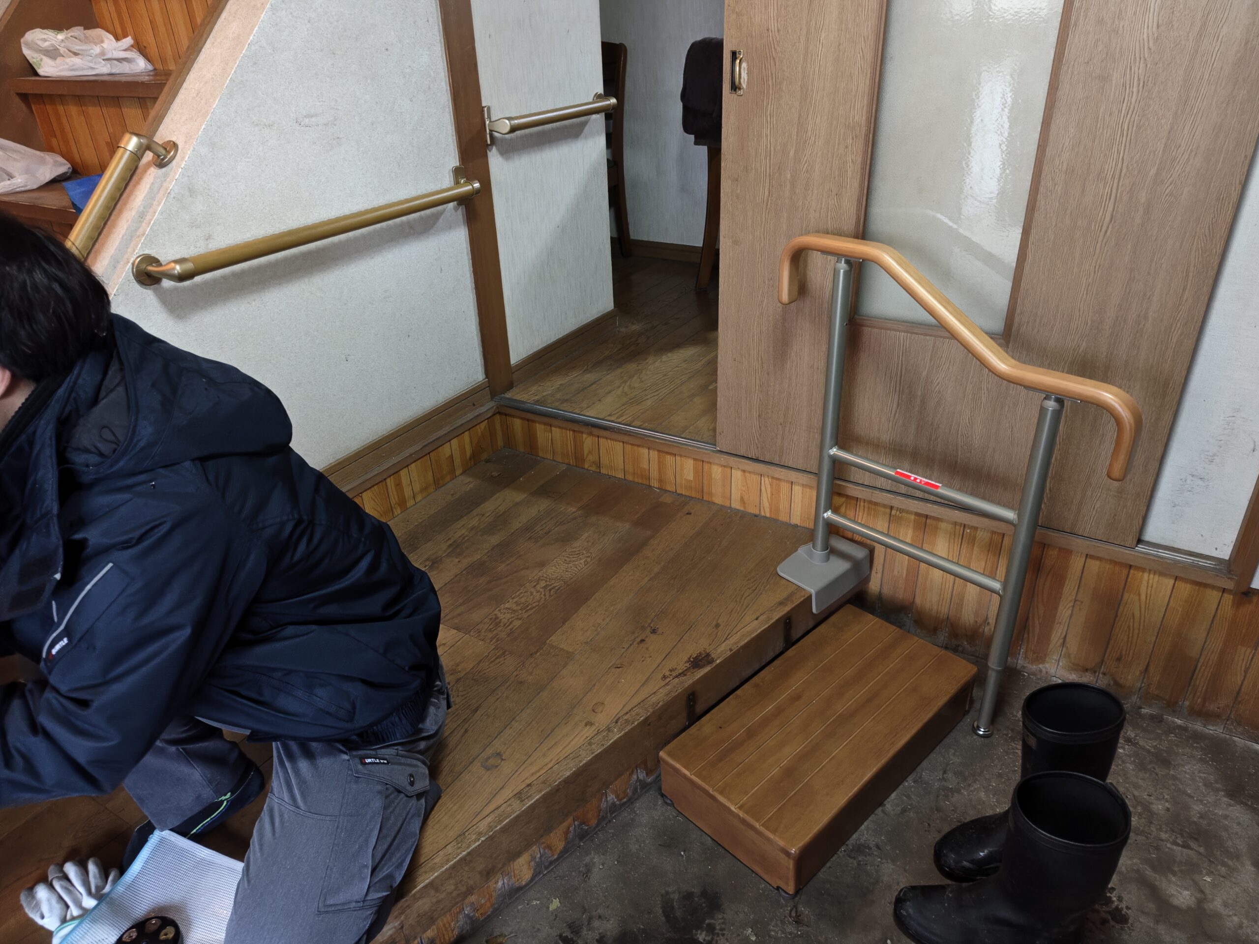 玄関の上がり框の段差には踏み台とスタンド手すりを設置して