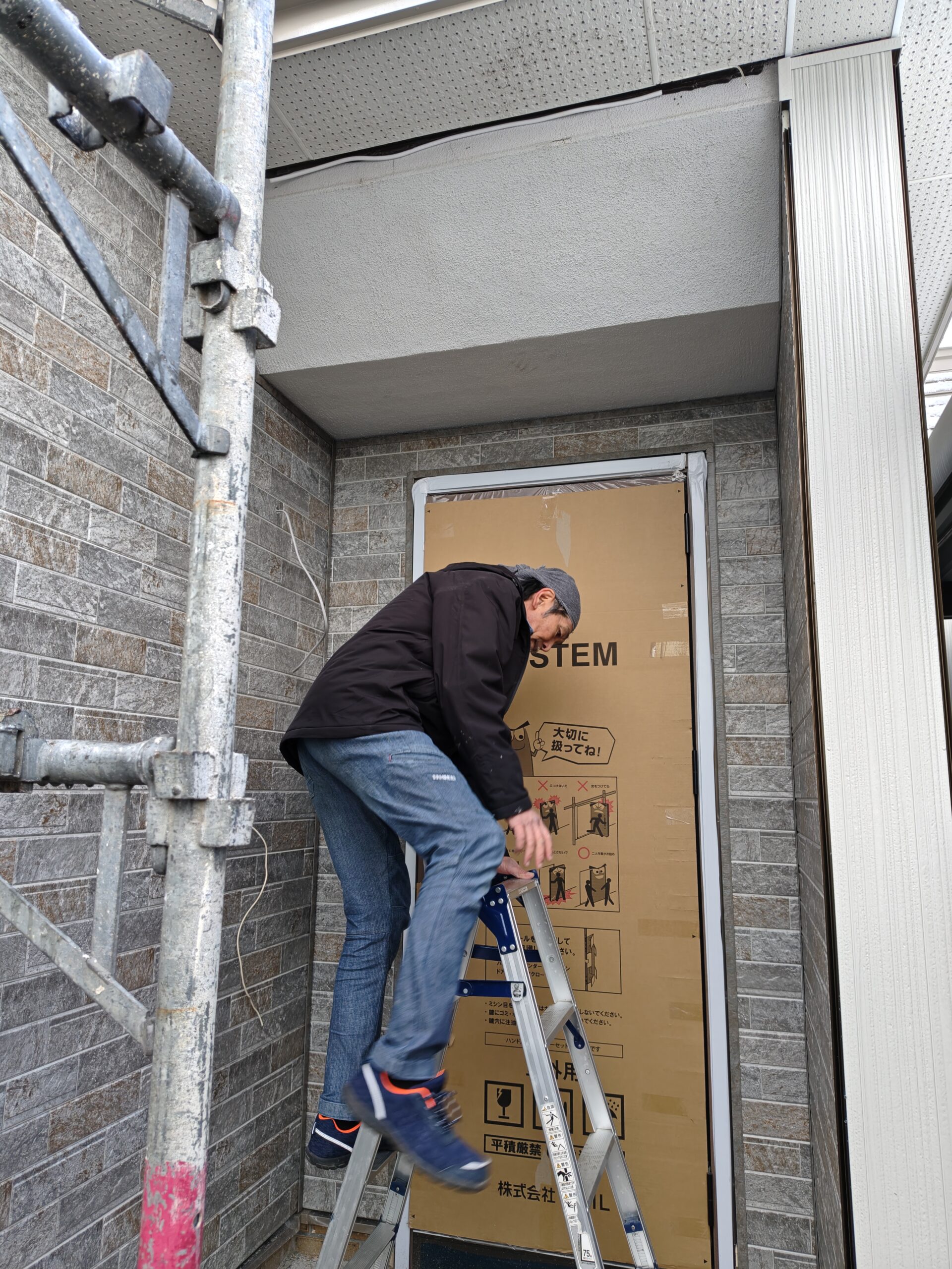 新しい玄関ドアと外壁サイディングの取り合いを打ち合わせしてます!