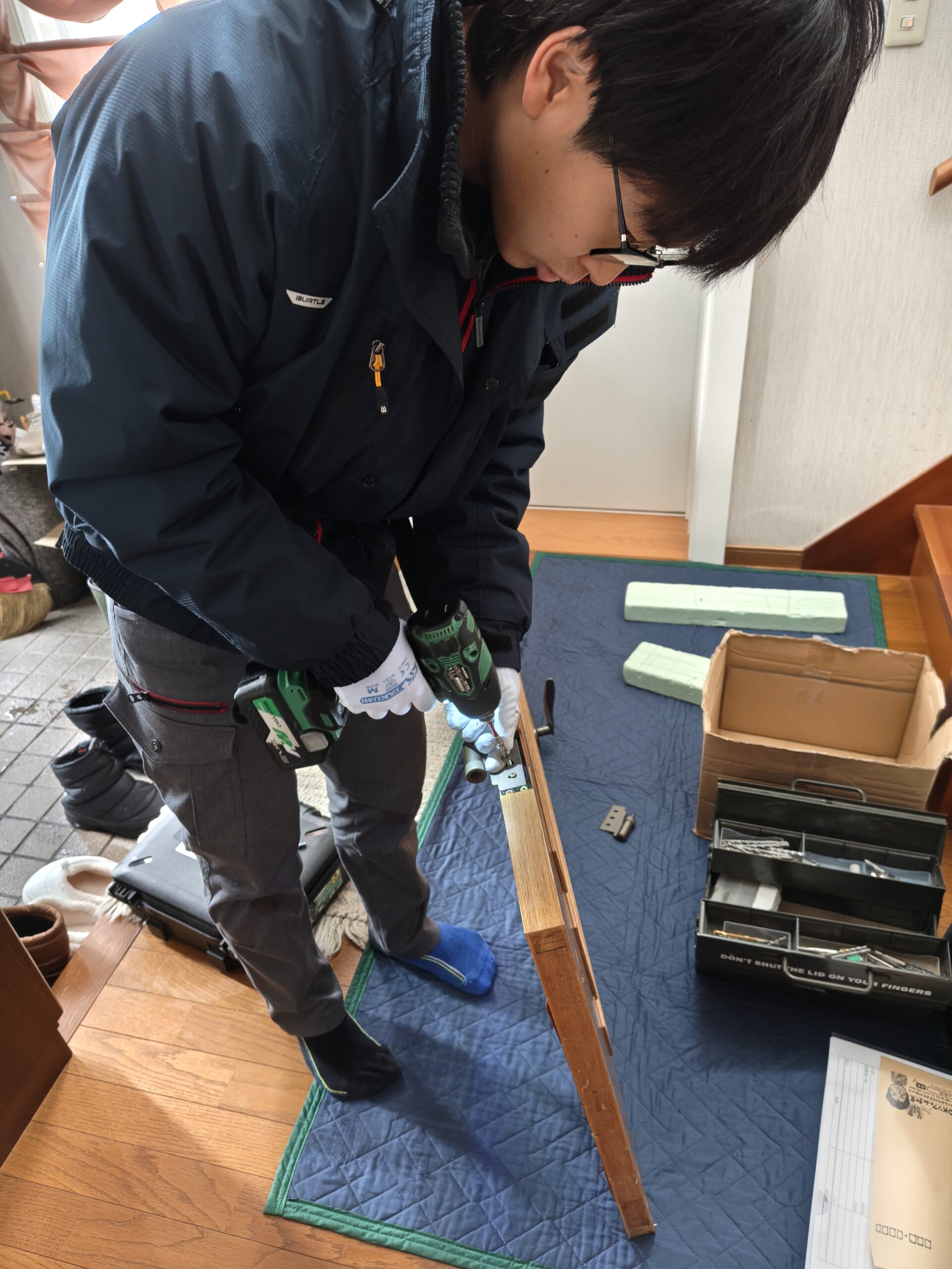 古くなった木製建具の丁番や戸車の交換工事をしてます!