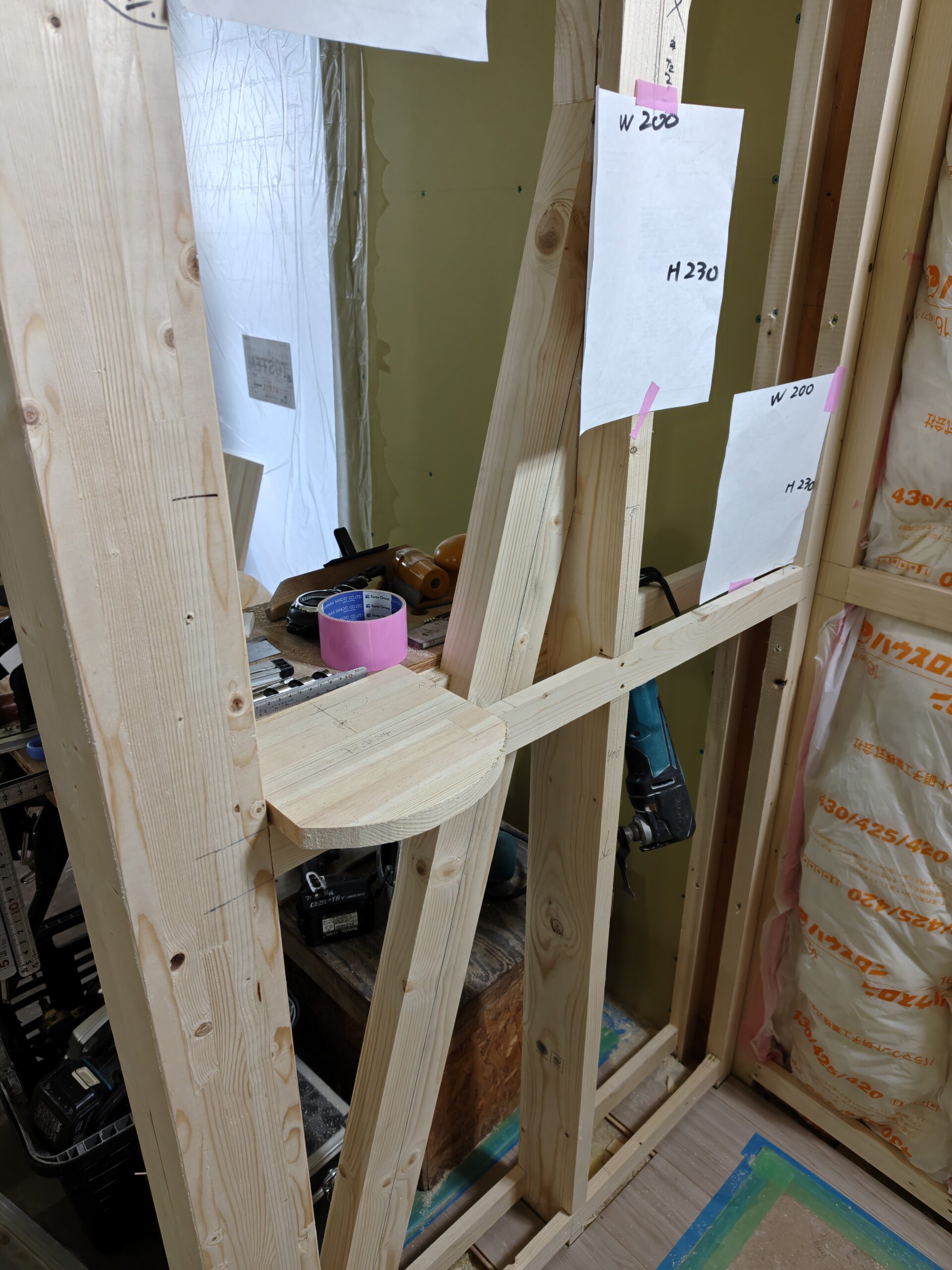 構造材を除けて、壁面ニッチ先端をジグソーでアレンジして場所をレイアウトしてます!
