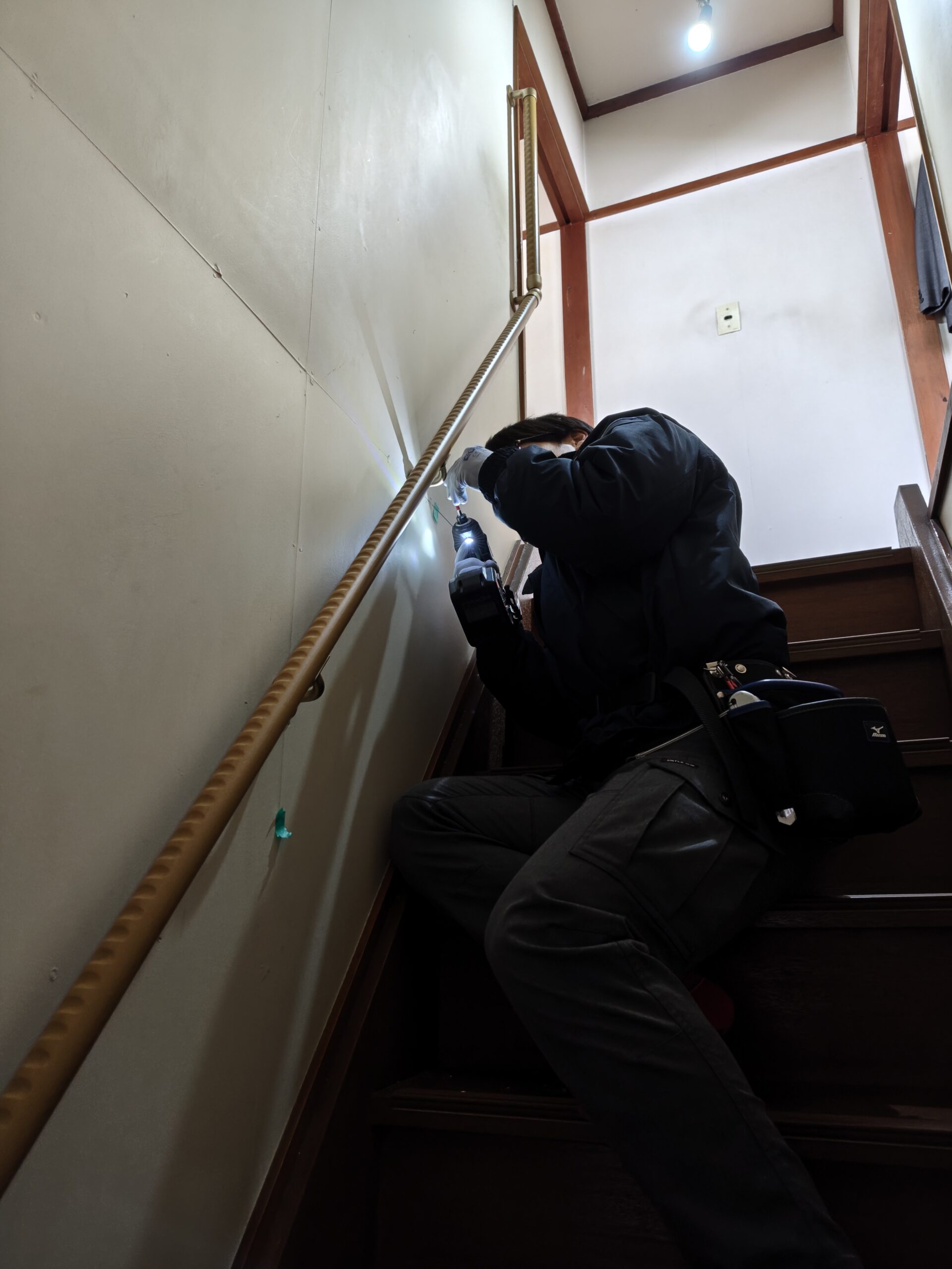下地を確認してがっちり手すり設置中