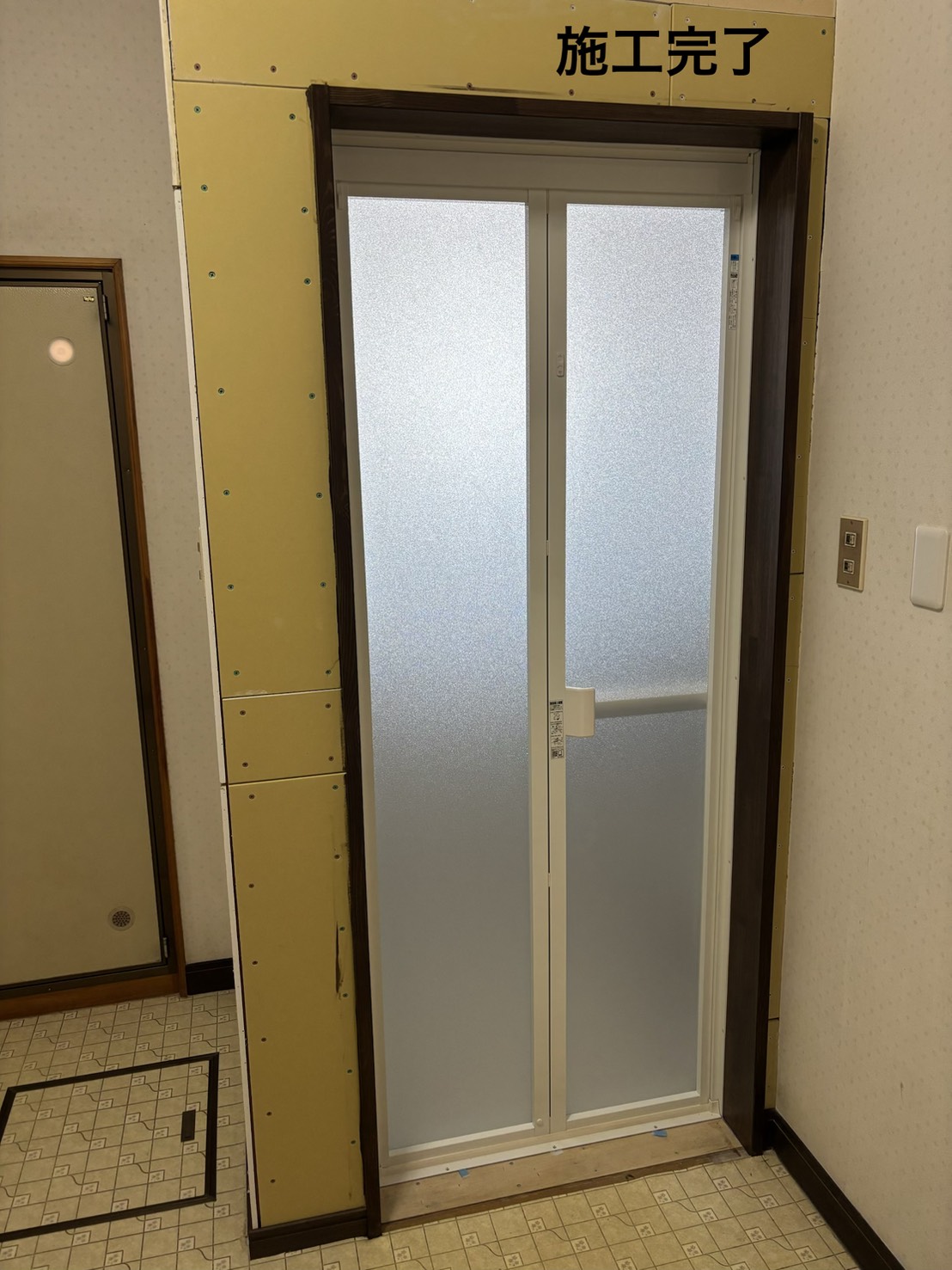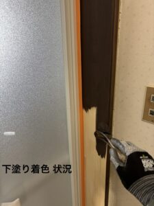 浴室の入り口枠を大工さんが綺麗に造作したら最後に塗装工事に入ります