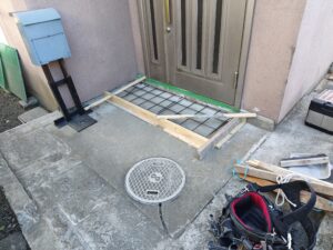 玄関ドア前の段差に、きっちり差筋してコンクリート踏み台を施工中です