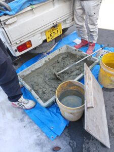 砂セメント砂利を丁寧に手練りして、打設に入ります。