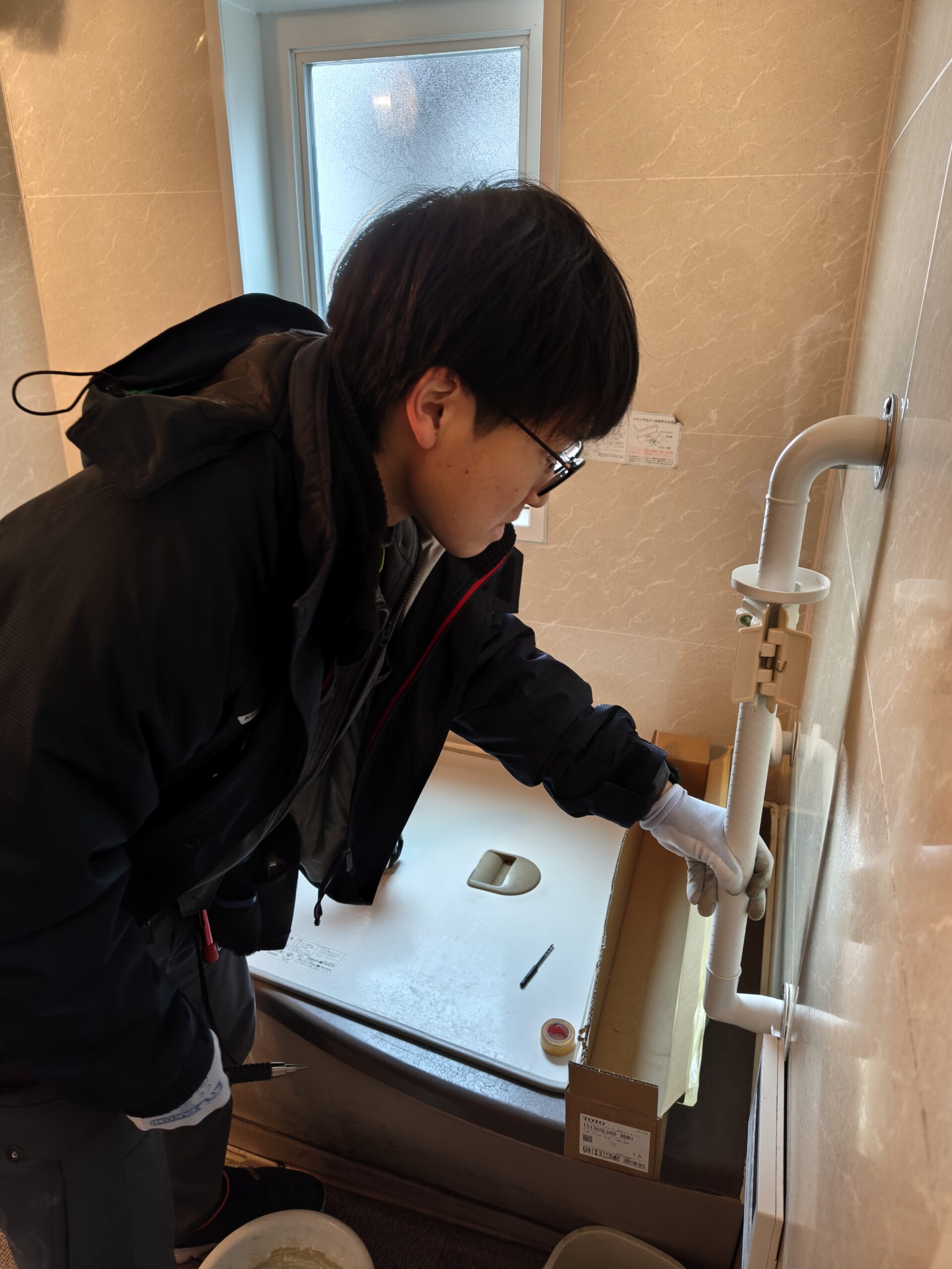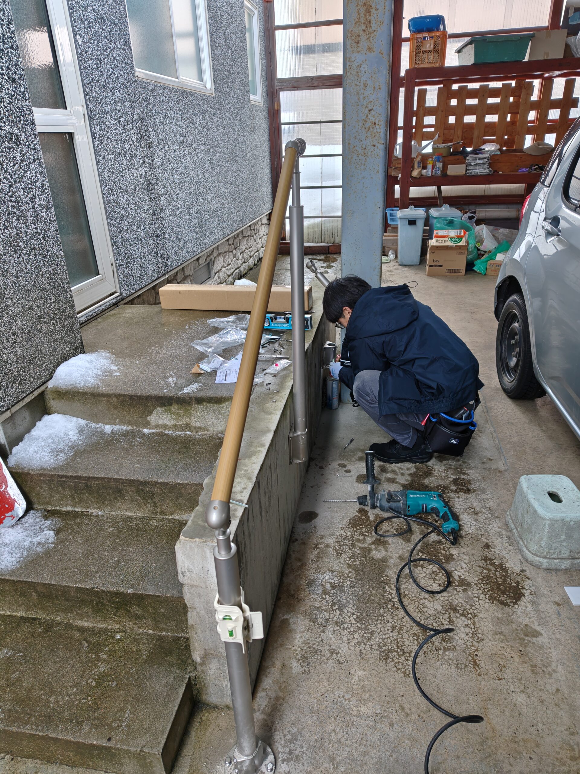 2026-02-13 バリアフリー改修工事中 外階段と浴室に手すり コンクリート外側に側面ブラケット金物を設置して、階段の広さを妨げない掴まりやすい手すりを設置 出入り口から浴槽のまたぎ動作の安定と浴槽内の移動に樹脂製L型手すりを設置中!