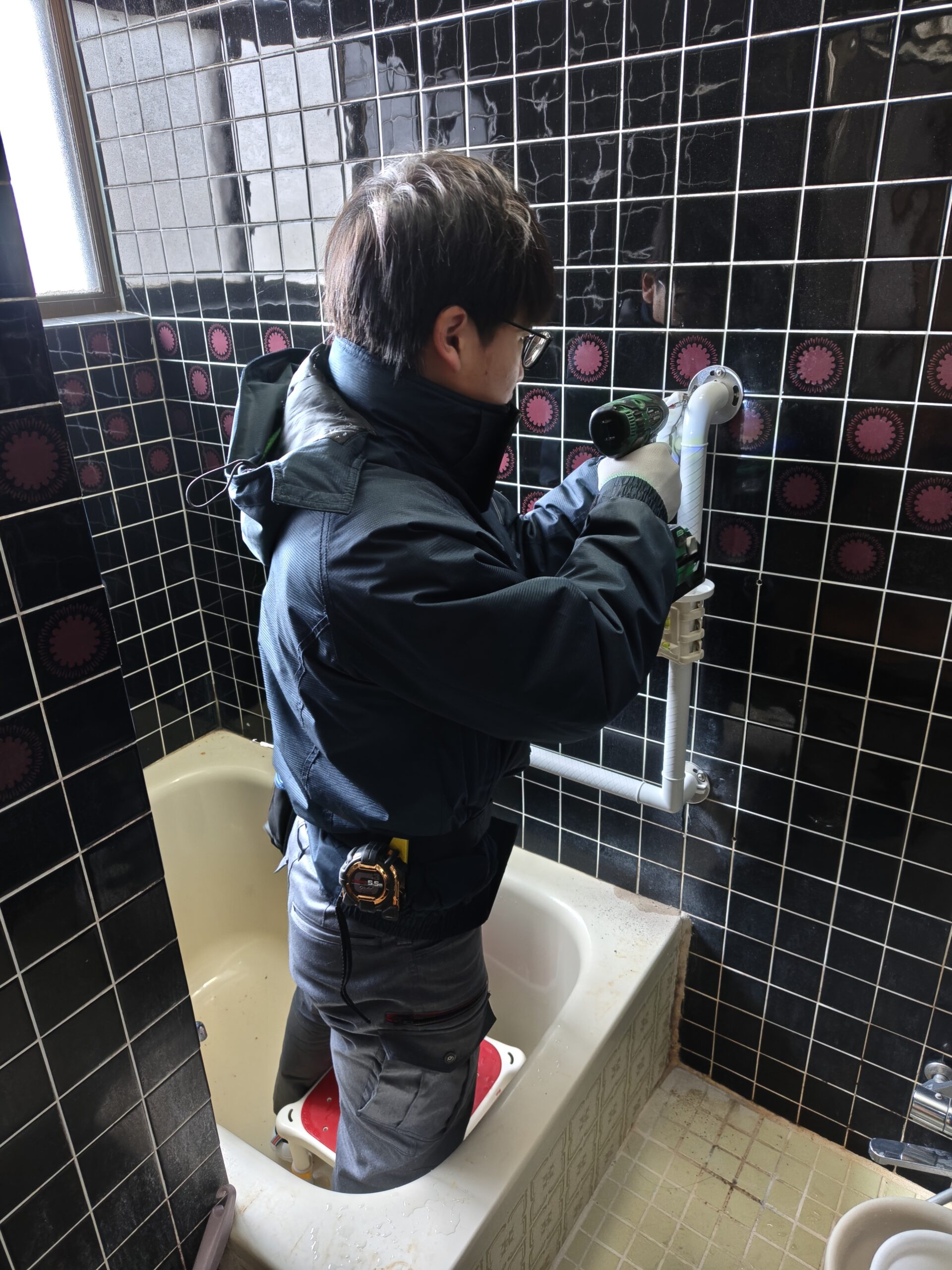 2026-02-16 タイル壁にL型手すり設置中 浴室タイル壁に手すりが無く、不安です 何とかお願い致します! 浴室の浴槽またぎ動作から浴槽内の移動にL型手すりを設置中です! タイル壁に掴まりやすい高さに一つ一つドリルで穴を開けていきます!