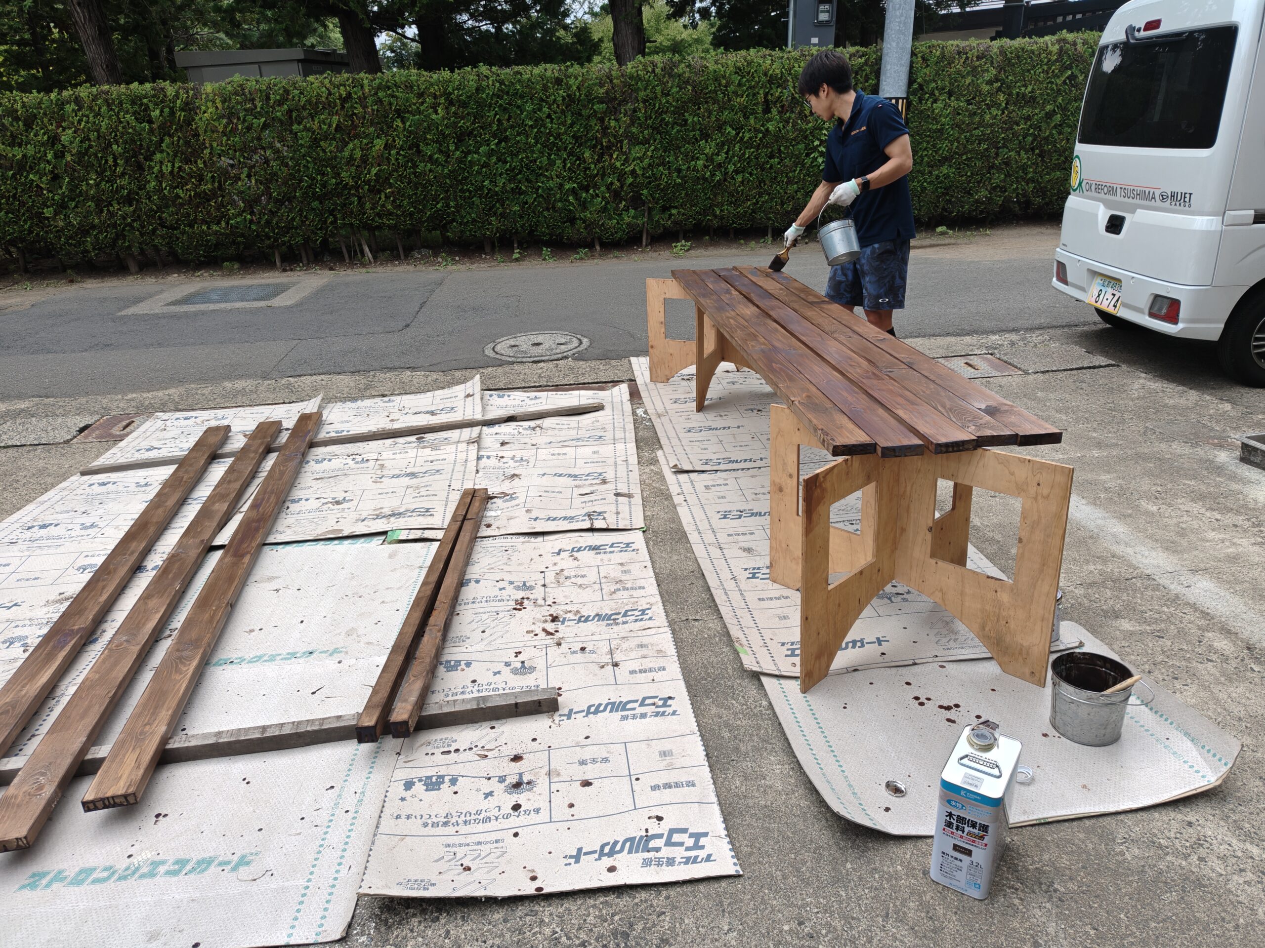 窓の高さと幅に合わせて木材を加工して、保護塗料で仕上げます。