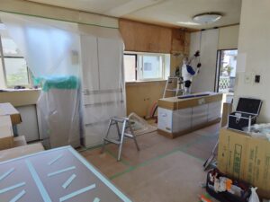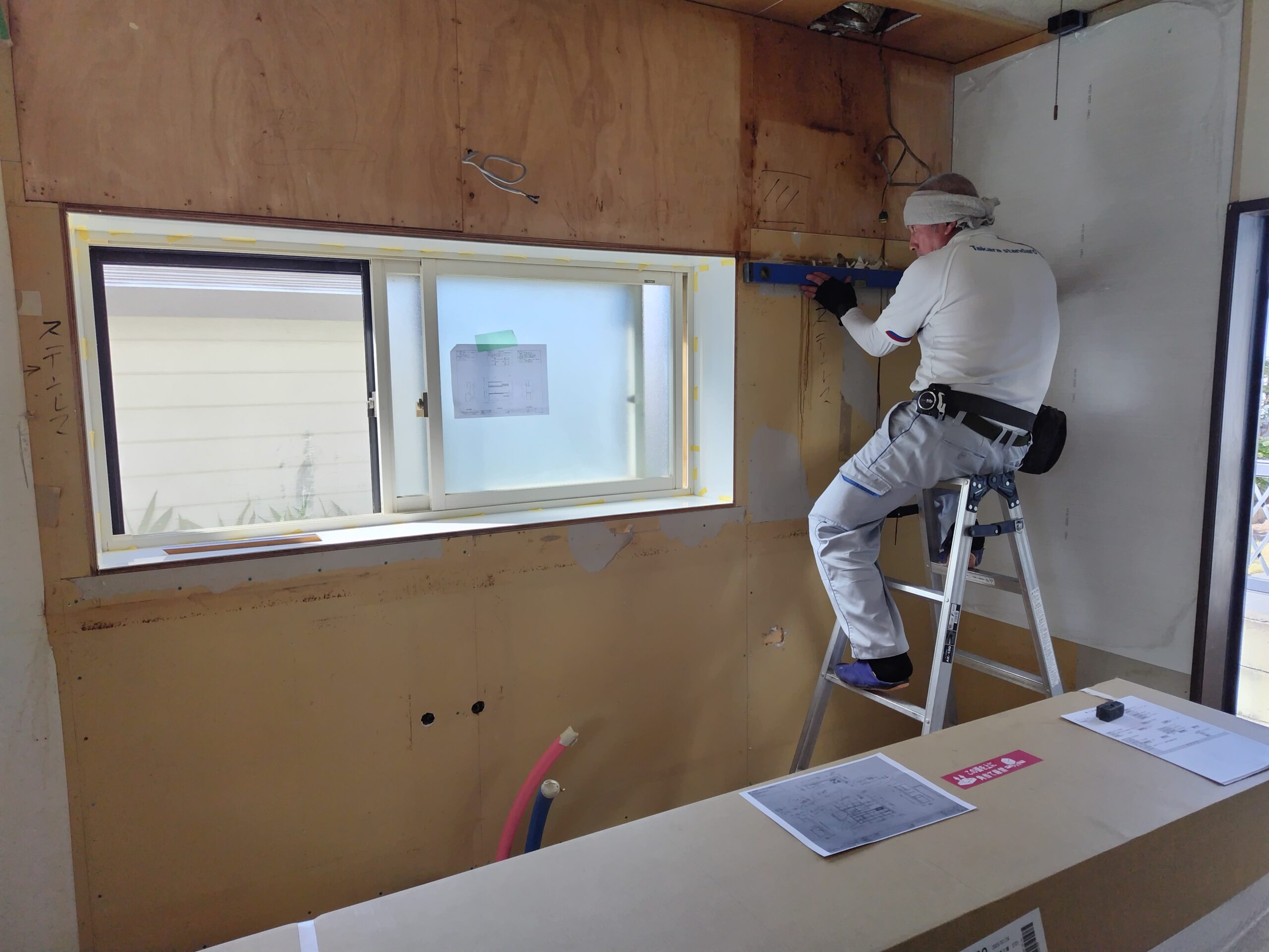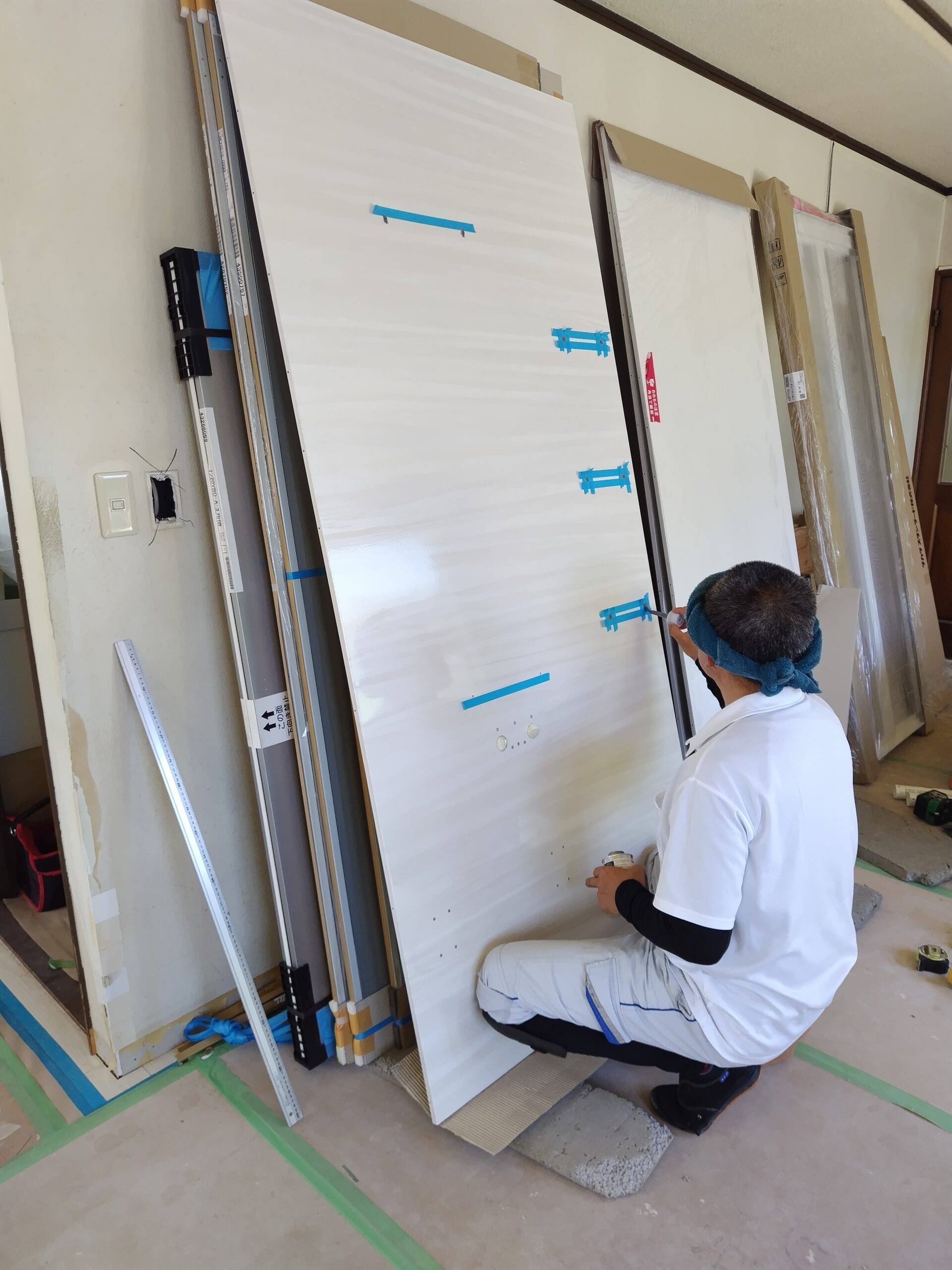 2025-07-30 きっちりキッチン施工中! 古くなったキッチンを撤去して、新しいキッチンを設置してます! キッチンパネル割り墨に従い両面テープと専用接着剤を充填して 右左5ミリ程はパネル割り墨できっちりと確認して 次の工程へ進みます