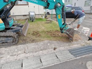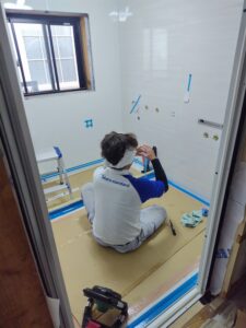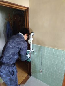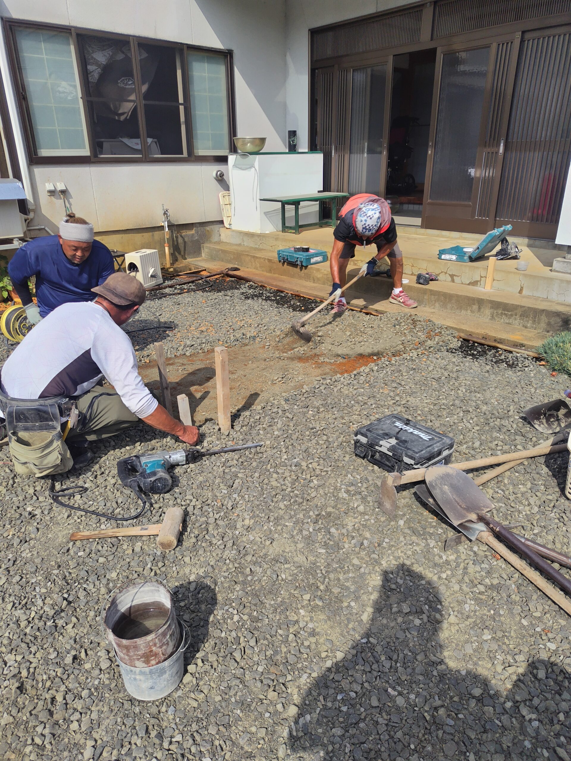 2025-08-04 下地ブロックに手すり設置中! ここに掴まる所が欲しいな トイレの出入り口の扉の開閉時にしっかり掴まって移動しやすい高さに設置致します😊 下地はブロックとタイルでもしっかり設置致します安心してください